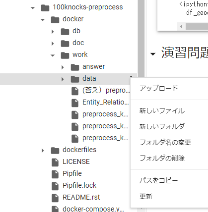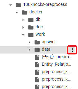 ②該当フォルダの縦の3つの点をクリック。今回は、100knocks-preprocess/docker/work/dataなので、dataの縦の3つの点をクリック