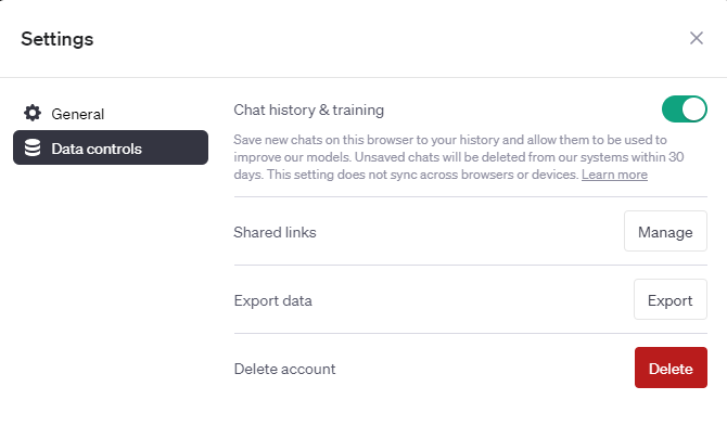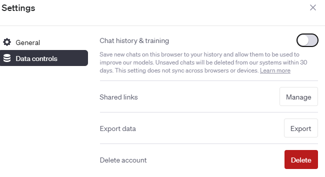 この設定をすることで、ChatGPTでの新しいやり取りはモデルのトレーニングに使用されません。また、履歴サイドバーにも表示されません