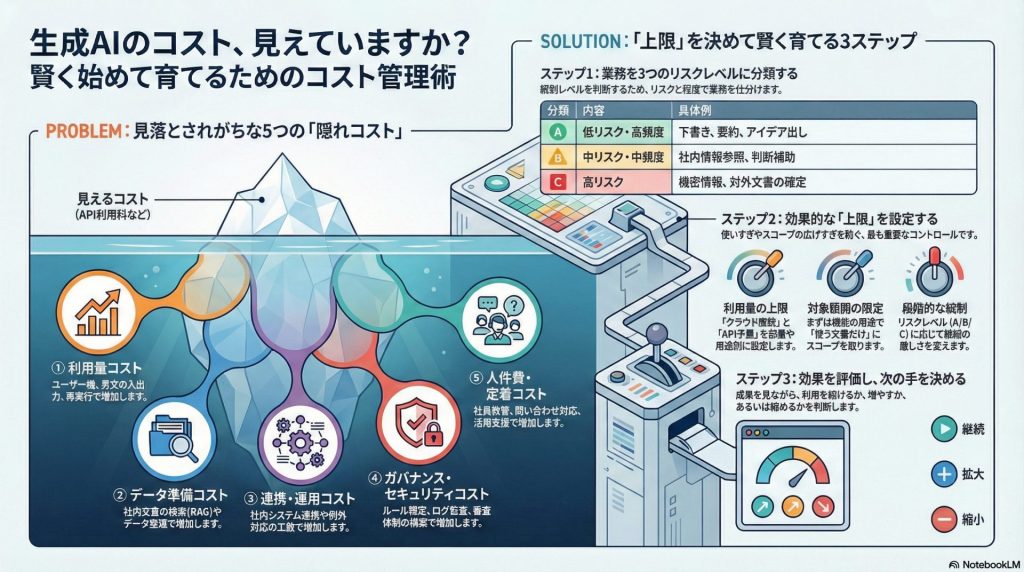 ④ ガバナンス・セキュリティコスト(守るほど増える)ルール、審査、ログ、監査対応利用に比例して統制レベルを決める(用途/情報区分で段階)高リスク用途から先に厚く。利用が広がったら段階的に強化する