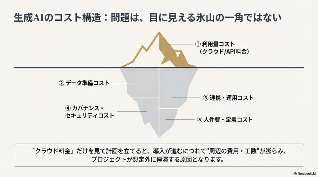生成AIのコストというと、つい「クラウド料金」「API料金」だけを見がちです。