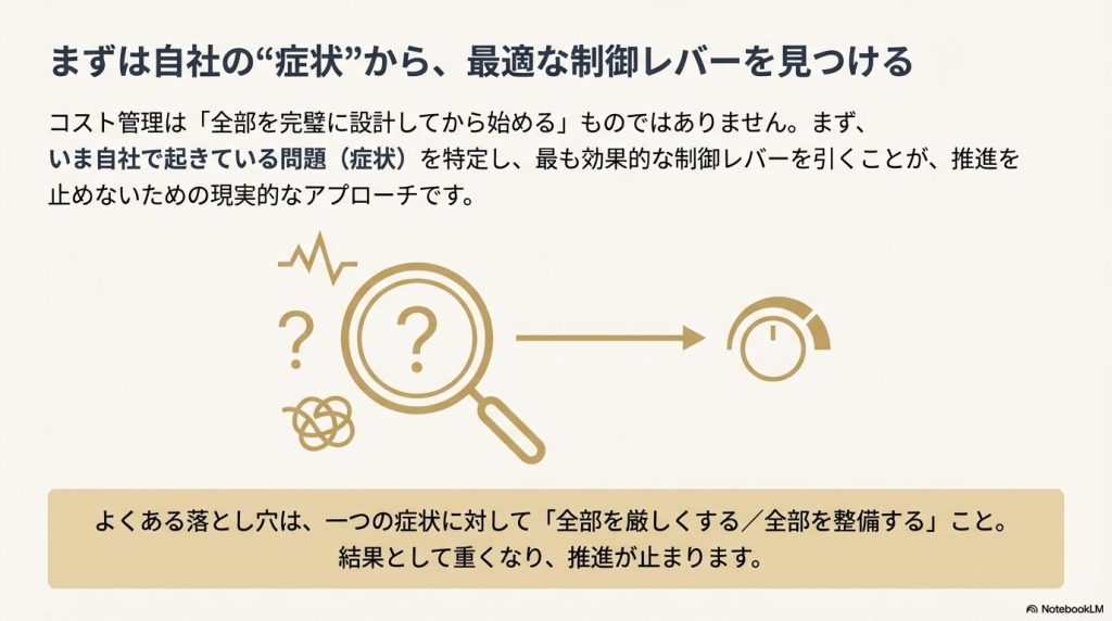 コスト管理は「全部設計してから始める」話ではありません。まずいま詰まりかけている場所を見分けて、そこを制御するのが現実的です。