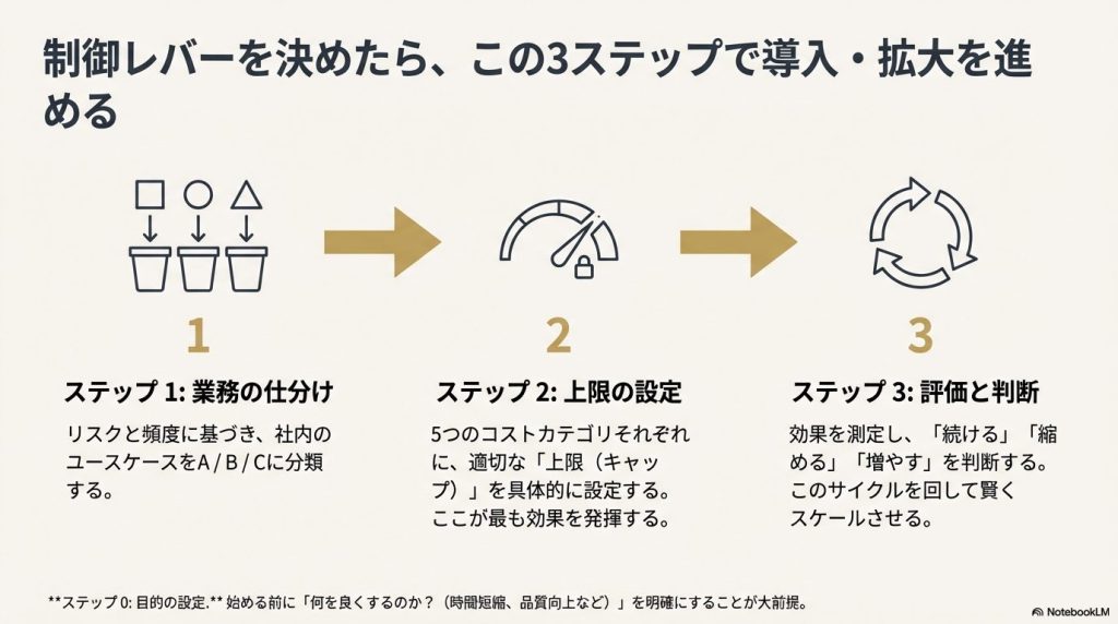 ① 利用量コスト(使うほど増える)利用者増、長文入力、出力長、再実行クラウド利用数(席/アカウント)上限API利用料(予算)上限A用途(低リスク・定型)から広げる。テンプレで入出力を短くし、再実行を減らす