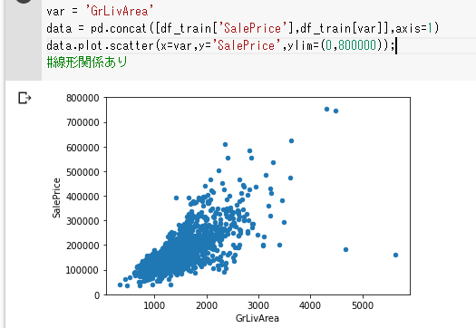 GrLivArea(リビングの広さ)とSalePriceの関係をplot.scatter()を用いて散布図でみてみます。