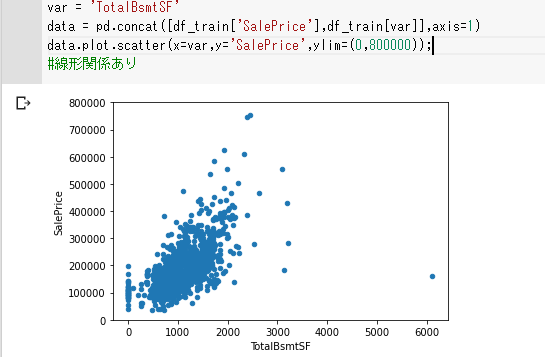 TotalBsmtSF(地下室面積)とSalePriceの関係をplot.scatter()散布図でみてみます。
