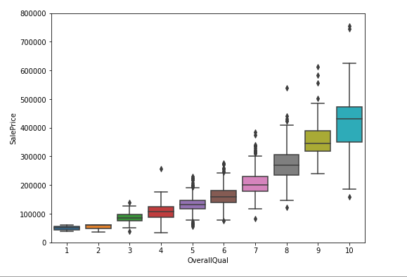 OverallQual(全体的な素材と仕上げの品質)とSalePriceの関係をboxplot()をはこひげ図でみてみます。