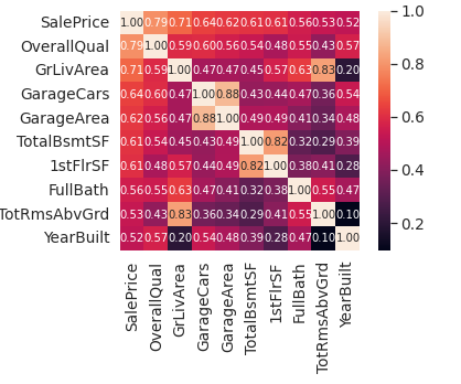 hm = sns.heatmap(cm,cbar=True,annot=True,square=True,fmt='.2f',annot_kws={'size':10},yticklabels=cols.values,xticklabels=cols.values)