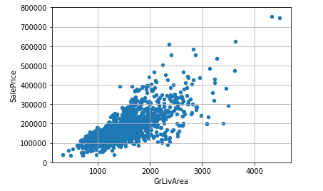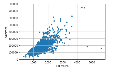 右下にGrLivAreaが極端に大きく、価格が安いものが2つあるのがわかります。