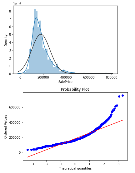 SalePriceは正の歪度(右傾化)を示し、対角線に沿わないので正規分布ではありません。