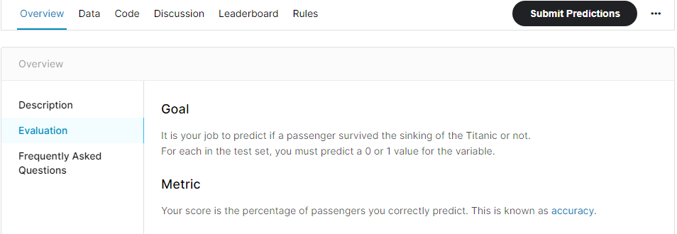 例えば、TitanicのEvaluationをみると評価指標はaccuracyと書いてあります。