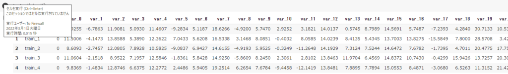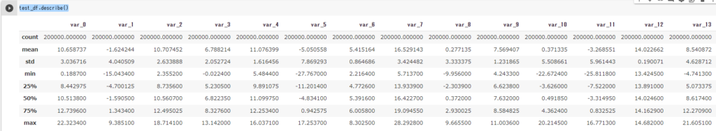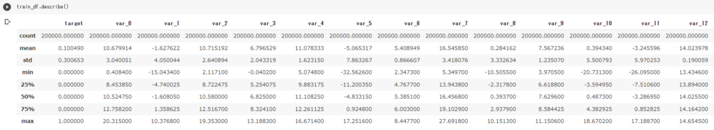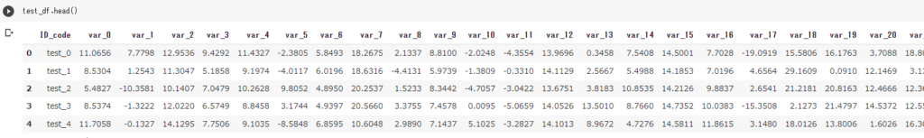データは非正規化されており、各行には数字だけで識別された200個の数値(var_0~var_199)が含まれています。