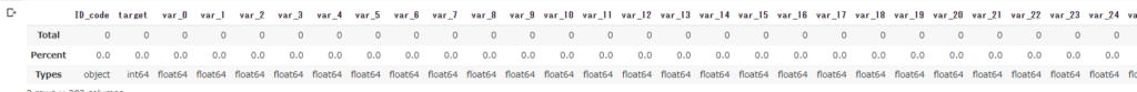 また、データの種類は、ID_codeがobject型、targetがint64型、var_はfloat64型です。